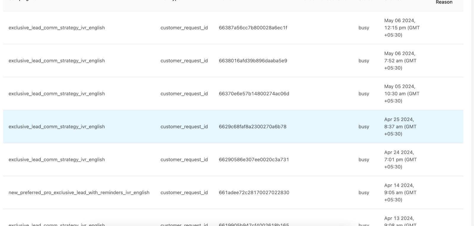 b. If IVR(automated call done to partner for informing about lead) is there in logs but status is “busy” it means the pro has either disconnected the call or blocked our IVR number (01141182777). If the status says “no answer” - it means UC has called the pro but the pro has not picked UC's IVR call. In such scenarios, we cannot do anything as we had tried calling the pro. Ask Partner to attend UC's IVR call or unblock the IVR number to start receiving IVR .