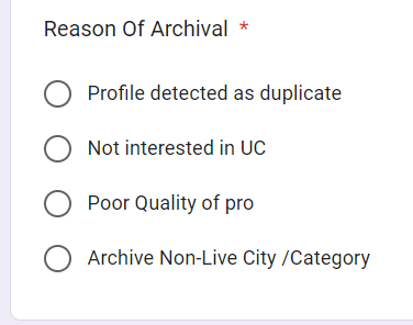 Note: While filling the Archival form, under "Reason of Archival" we should not select "Profile detected as duplicate" and "Poor Quality of Pro" option.