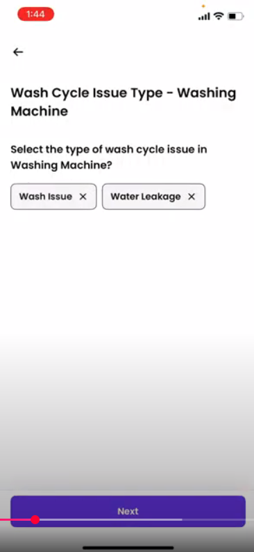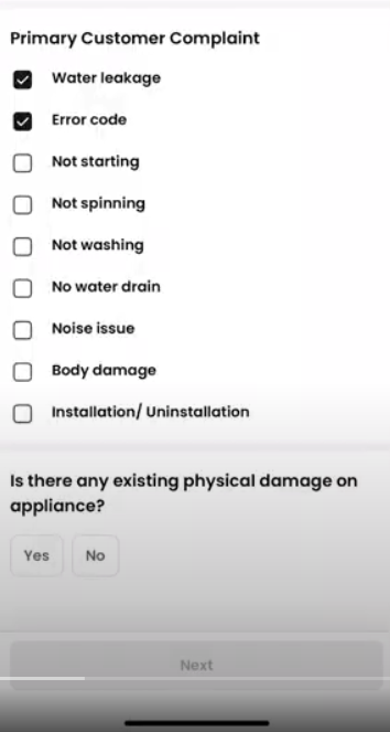 5. Now the partner must provide information regarding the wash cycle issue type, whether it's a wash issue or water leakage."