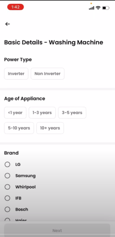1st Stage- Basic details like age of appliance, Model, Brand etc.